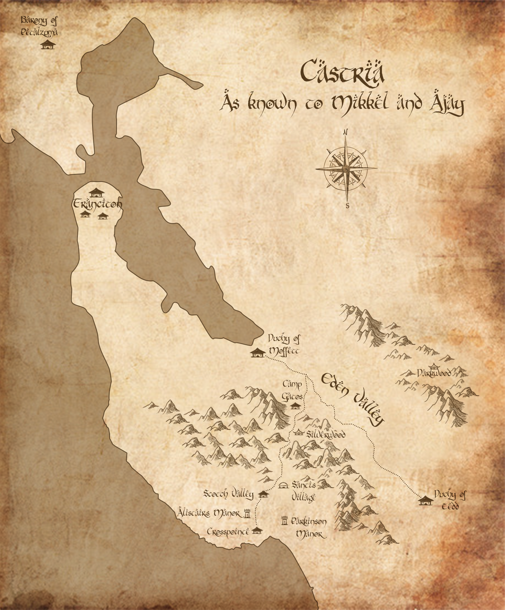 Castria is a continent on a parallel universe to our own, one that appears to be perpetually stuck in the middle-ages, but filled with magic and fantastical creatures. Only a very small portion of the continent has been explored by Ajay and Mikkel, those parts corresponding to the central California coast on Terra.