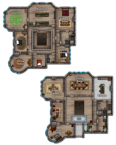 Alastair’s Manor is a large stone structure that sits on a hill overlooking the town of Crosspointe. It is an elegantly appointed home with spacious living areas. It has four bedrooms, plus sleeping quarters for three servants. In addition to a library and three common living spaces, it has a large workroom where Alastair studies and experiments, it has a large private sanctum with a spellcasting circle. It is sometimes the Castrian residence of Ajay, Alastair’s’ apprentice. The house rests at a crossing point of ley lines, and is considered a place of power.